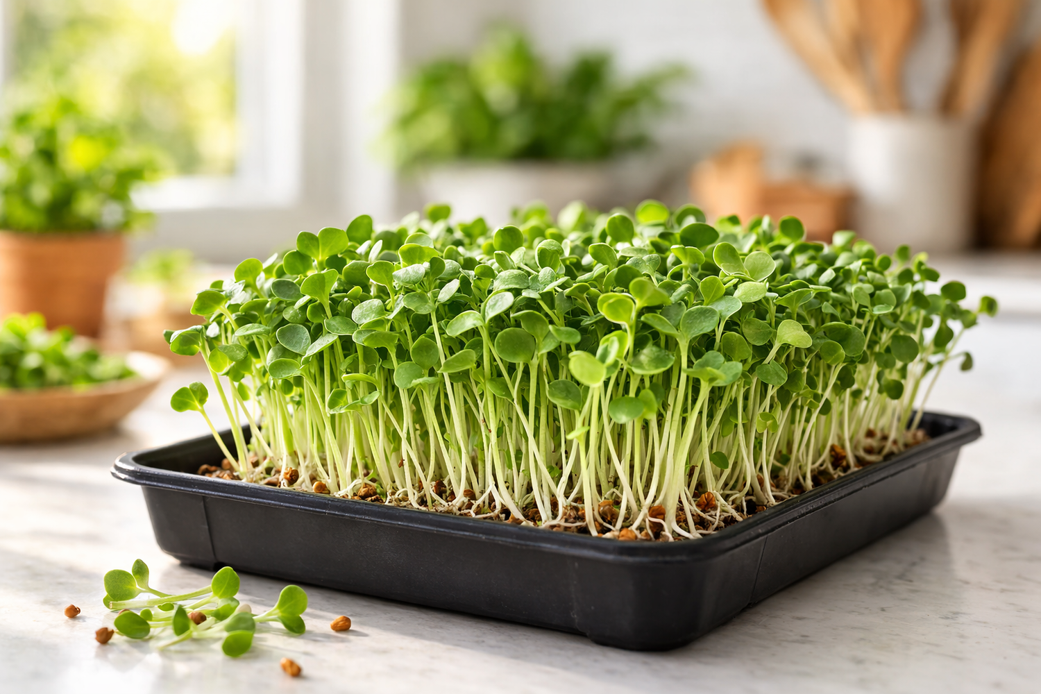 Microgreens are tiny plants with huge nutrition. • Up to 40x more nutrients than vegetables • Ready in just 7–10 days • Easy to grow indoors • Kids love watching them grow
